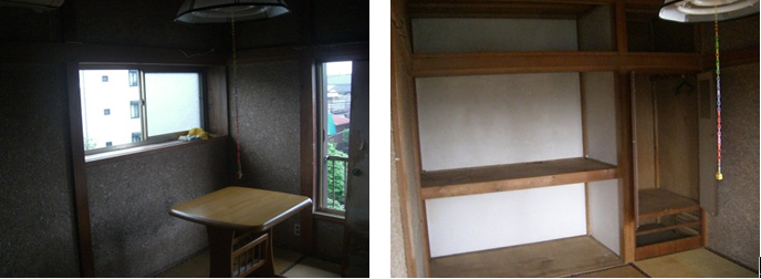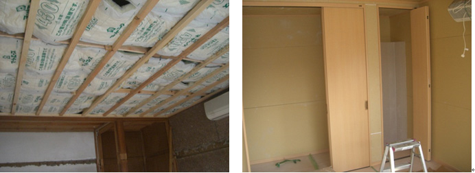 サッシを入れ替え、床は畳だったので下地を入れフローリングに。天井は一度解体して下地と断熱材を入れ貼り直し。建具も間口が大きく機能的なスライド式と折れ戸にしました。