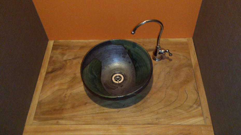 トイレの手洗いも特注品の陶器、天板はケアキの古材です