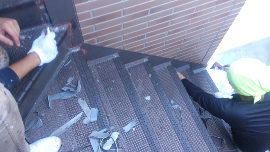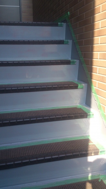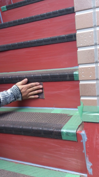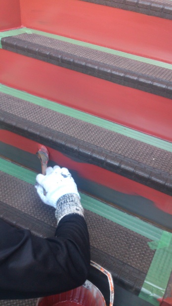 その後に防水材の主剤を鉄骨階段のささら、蹴上部分に塗布していきます。